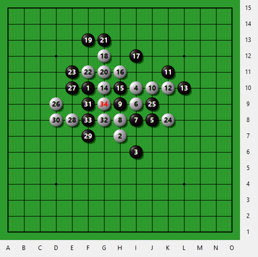 这是一个有名的开局,在一年多前我曾和一些朋友讨论过此开局。在不给任何谱的知识前提下,45秒内给出平衡的4,5对于Yixin来说是困难的。实战中Yixin给出的4,5并不理想(深度只有13层),Alex给出黑7后,Yixin算出自己的8是必败的(16层)。之后Alex保持了黑必胜的优势,并至35手取得了胜利。